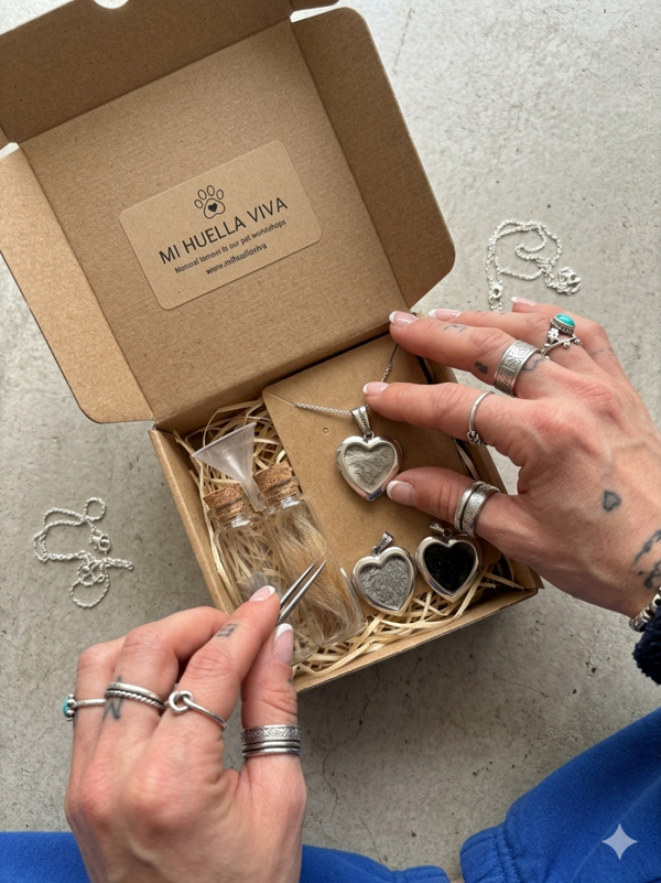 Con el kit de Mi Huella Viva no solo recibes el collar: también te enviamos el material necesario para que puedas crear en casa tu propio recuerdo con el pelo de tu mascota.